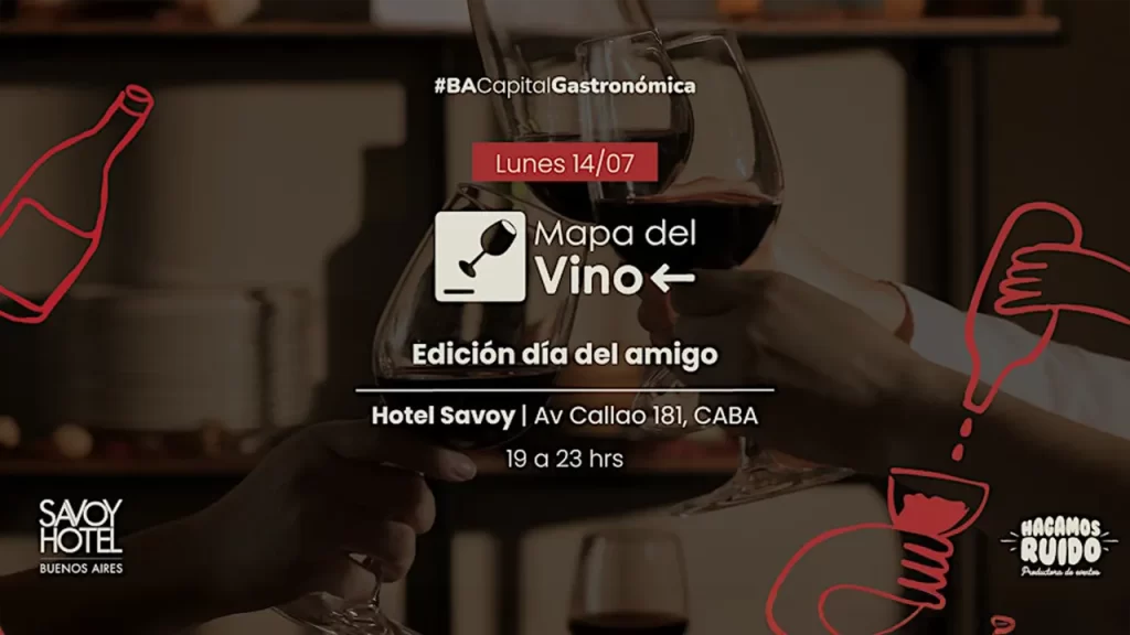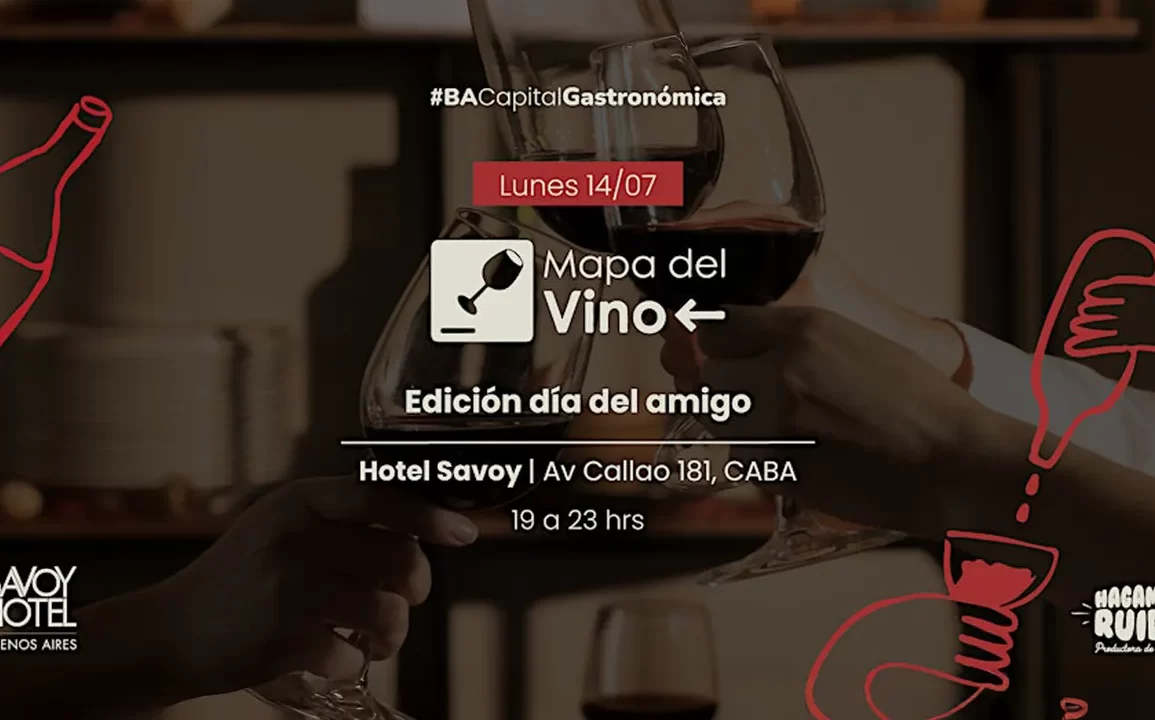El próximo Lunes 14 de Julio, de 19 a 23 h, el emblemático Savoy Hotel Buenos Aires (Av. Callao 181, CABA) será sede de una nueva edición de Mapa del Vino®, la feria creada por la sommelier Mariana Gil Juncal, que en esta oportunidad propone un brindis anticipado por el Día del Amigo.