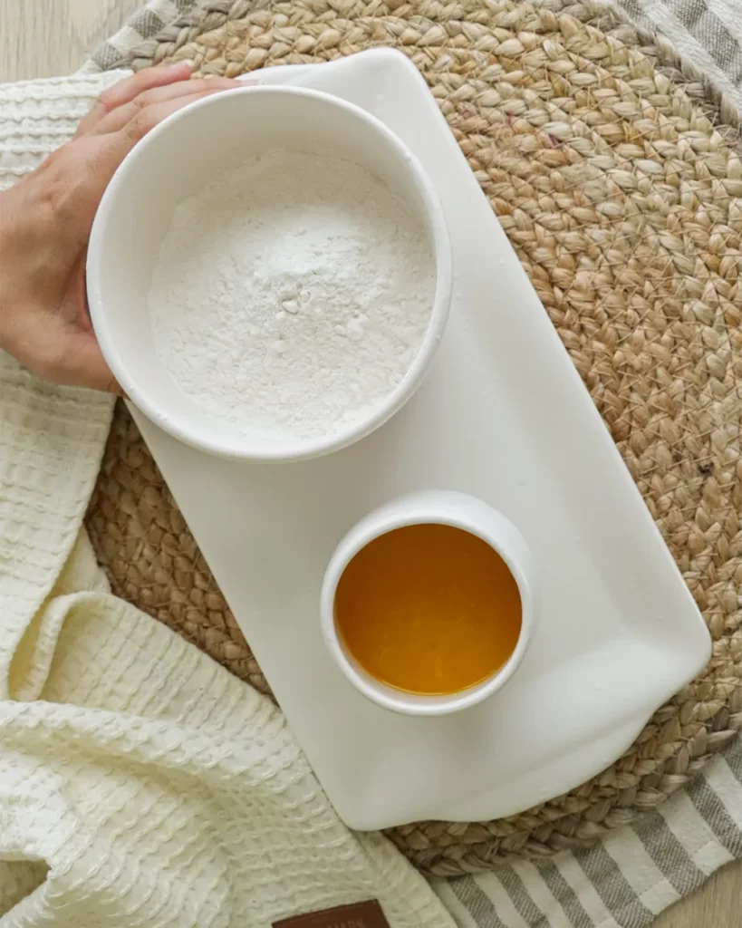 Luego añadir el jugo de naranja y mezclar nuevamente para incorporar. - Disponer una fuente para horno (20×30 cm.), enmantecada y enharinada.