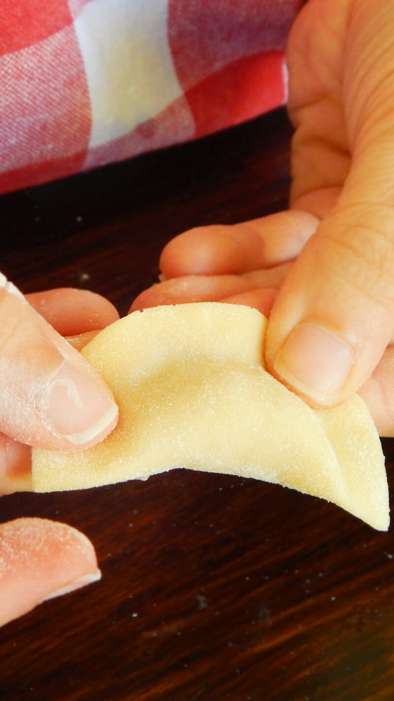 Con una cucharita, tomar un poco de relleno y colocarlo en el centro del disco de masa, doblar a la mitad, hacer presión sobre los bordes y unir las puntas.