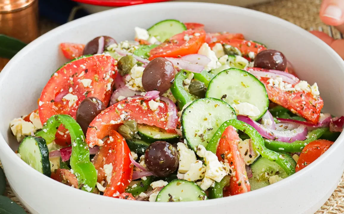 La ensalada griega, conocida localmente como Horiatiki, es una preparación típica de Grecia. Es un plato campesino, nacido de ingredientes simples y disponibles en casi cualquier casa: tomates maduros, pepino, cebolla, aceitunas y aceite de oliva, con Queso Feta como protagonista.