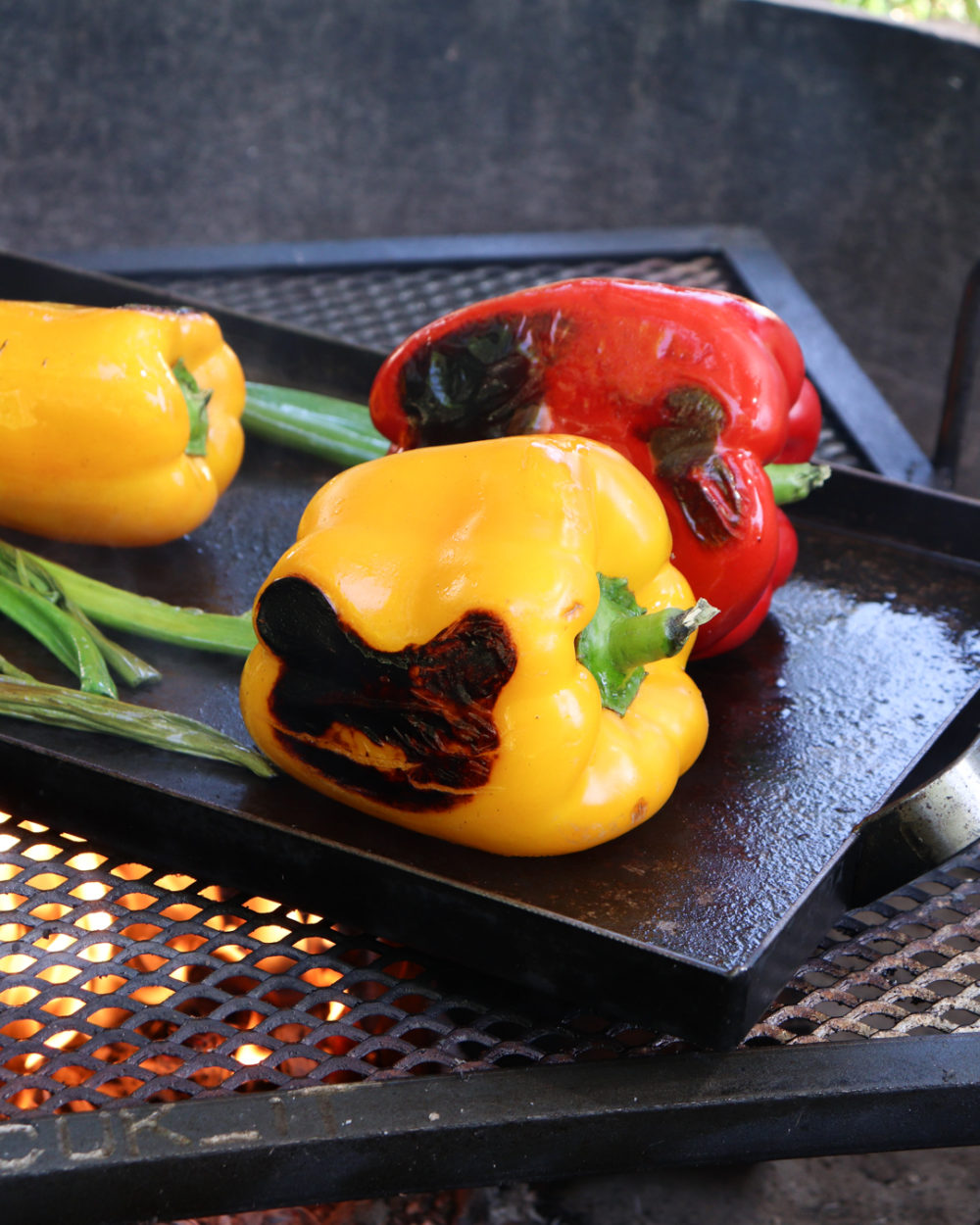 Con los morrones aún tibios, quitar la piel raspando con el filo de un cuchillo sobre la superficie. Luego quitarlas semillas y cortarlos en tiras de “2 dedos” de ancho. Reservar. -