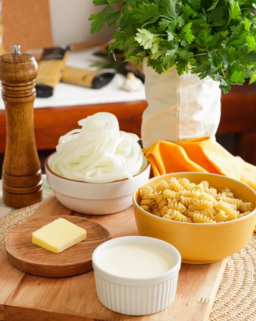 Las cebollas caramelizadas son un recurso clásico de la gastronomía francesa, donde se utilizan en sopas, tartas y salsas. En esta receta, las cebollas se cocinan lentamente en una mezcla de manteca y aceite de oliva hasta alcanzar ese punto dorado, suave y lleno de sabor. Luego se suma la crema para cocinar, que aporta una textura sedosa que envuelve la pasta y convierte este plato en un verdadero mimo al paladar.