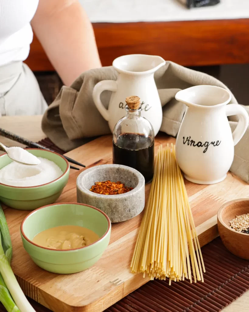 Nuestro fideo estilo Thai simplifica esos sabores para adaptarlos a ingredientes que se encuentran fácilmente en cualquier cocina: spaghetti, mantequilla de maní, salsa de soja, un poco de vinagre para el toque ácido y ají molido para ese picante característico.