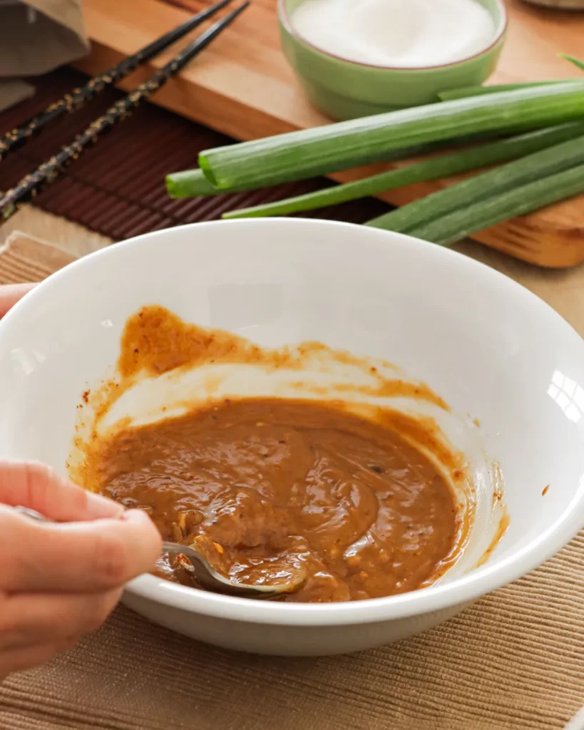En un bowl o plato amplio colocar la pasta de maní, salsa de soja, aceite, vinagre, azúcar y ají molido.