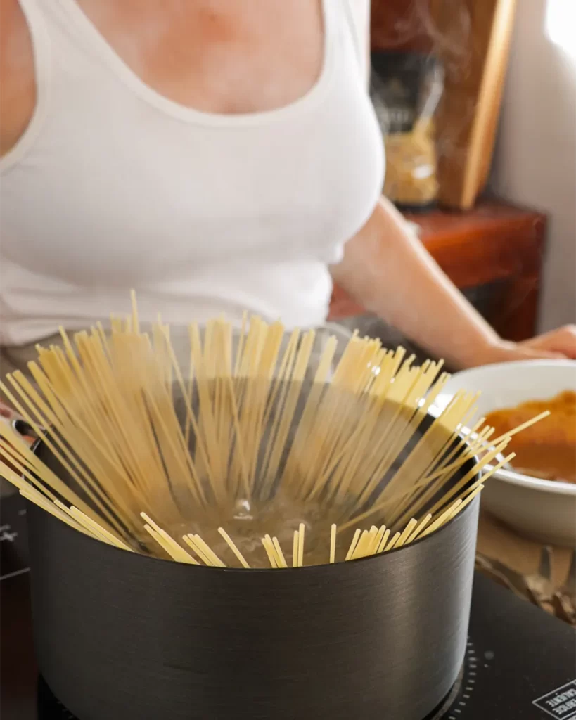 Una vez que hierve, añadir los Spaghetti y cocinar durante unos 8 minutos hasta que estén “al dente”. - Escurrir y añadir la pasta al bowl con la salsa. Mezclar bien para incorporar.