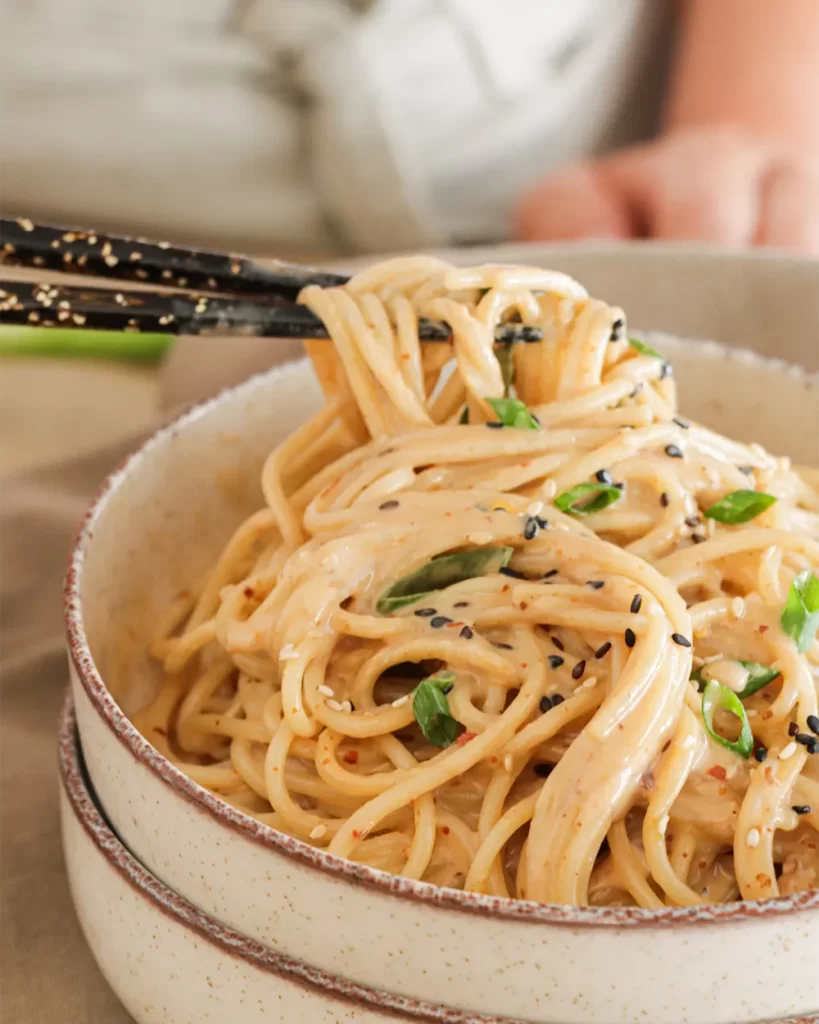¿Se animan a probar una pasta diferente y llena de sabor? Estos Fideos estilo Thai combinan ingredientes simples como mantequilla de maní, salsa de soja y cebolla de verdeo para lograr un plato rápido, fácil y delicioso. Con un equilibrio perfecto entre lo dulce, lo salado y un toque picante, esta receta es ideal para salir de la rutina y disfrutar de un almuerzo o cena diferente en casa.