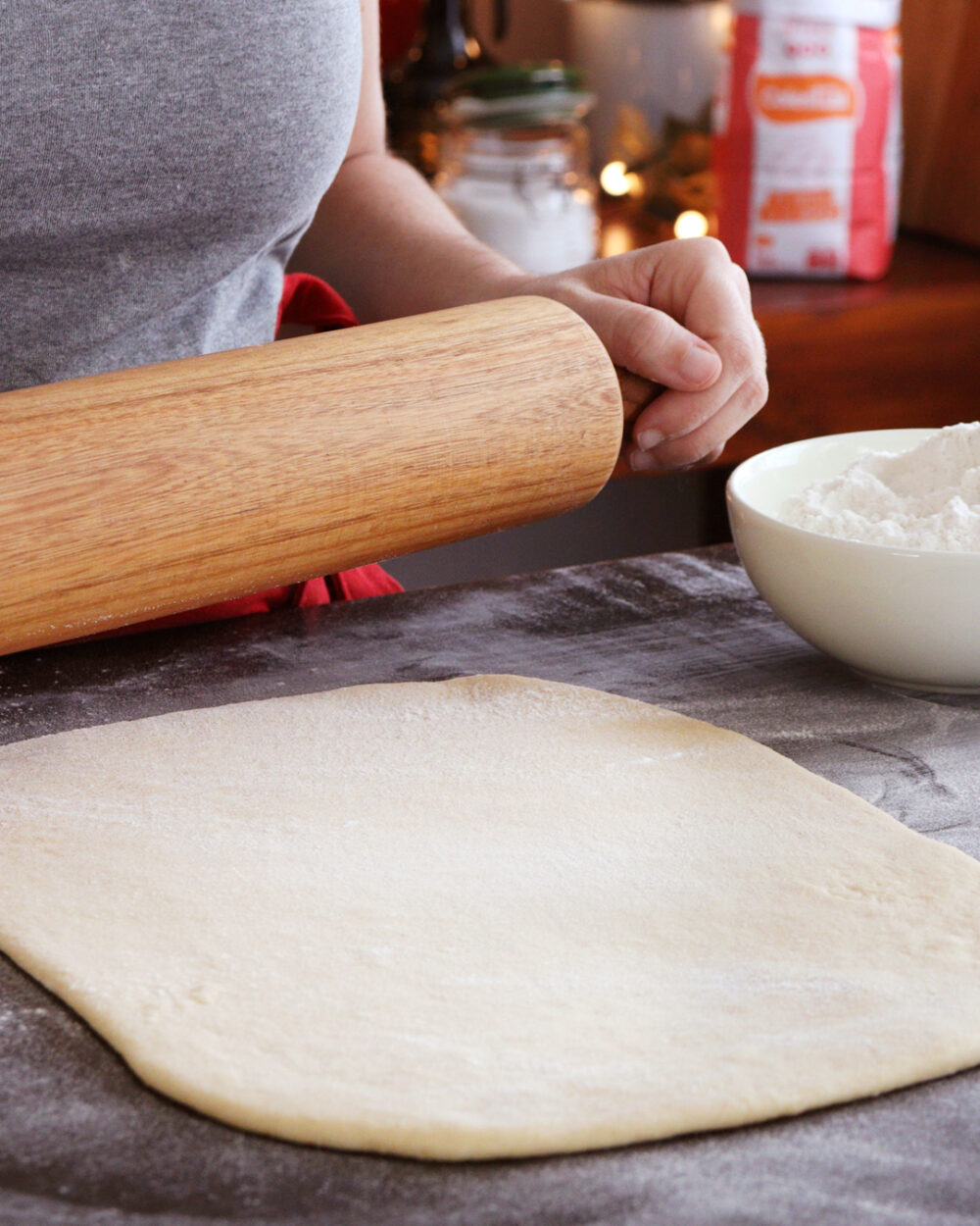 Hacer presión para desgasificar y luego con la ayuda de un palo comenzar a estirar la masa de forma rectangular hasta alcanzar un espesor de 1 centímetro.