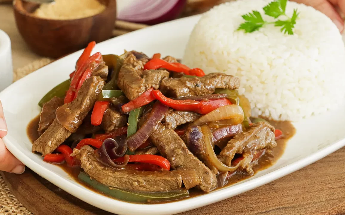 Un Salteado de Carne con Vegetales muy sabroso y lleno de color, inspirado en la cocina peruana.