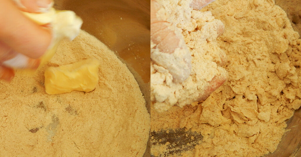 Agregar la manteca (pomada) y con la mano incorporar bien con los ingredientes secos. Debe quedar una textura arenada.