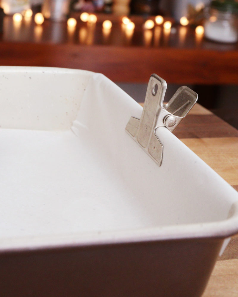 - Disponer una fuente o molde de 20 x 20 centímetros y cubrir la base con papel manteca.